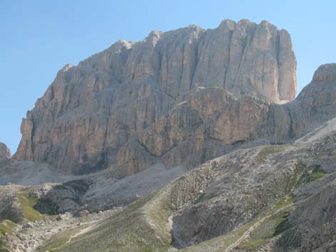 Das ist der Kesselkogel, den es zu überschreiten gilt. Der Name kommt von der Form (wie ein zerbeulter, umgedrehter Kessel...).
