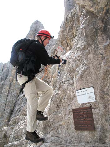 leichter als man aus der Entfernung denkt), geht es über kleine Felsstufen und Geröll zum Gipfel. Vor dem Gipfelgeröllfeld kommt noch eine ca. 2m hohe Stufe, die nicht versichert, aber unschwierig (I) ist. Über das