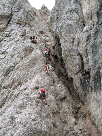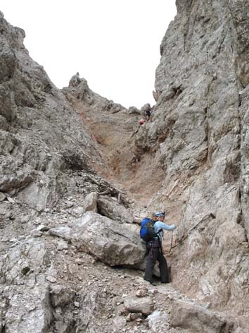 einer Rampe. Es kommen danach zwei Felsbänder, die man überklettern muss (Stahlseil). Über ein steiles Mini-Kar (Stahlseil) gelangt man schliesslich zur Gamsscharte (ca. 2650m). Bis hierhin braucht man vielleicht
