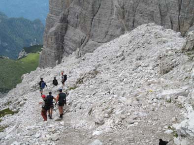 (Vorsicht!). Wir haben ein Stück nach der Seenscharte (Forc. de Laghi, ca. 2590m) übrigens die Abkürzung das Schotterkar rechts herunter (es gibt einen Weg, rel. gut zu erkennen) genommen. Der Abstieg ist zwar