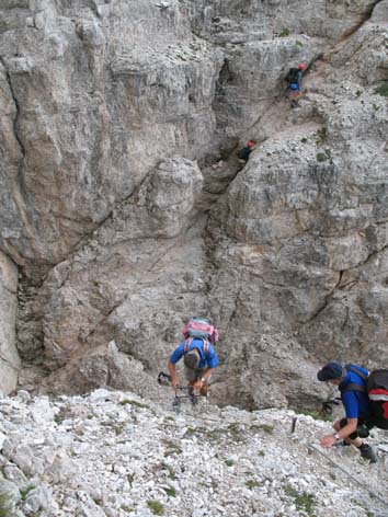 45min bis eine Stunde. Hier wendet man sich nach rechts, geht 5-6m herunter. Dann folgt eine ziemlich steile Felsstufe (ca. 15-20m), die mit 3 Stahlseilen versichert ist. Hat man dieses Hindernis genommen (geht